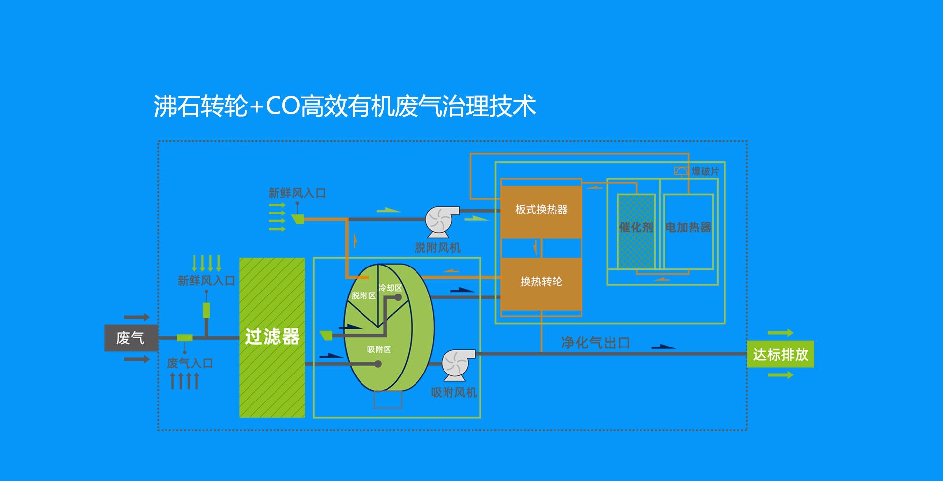 大風量、低濃度的有機廢氣的高效治理技術,適用于連續運行,降低設備投資及運維能耗。